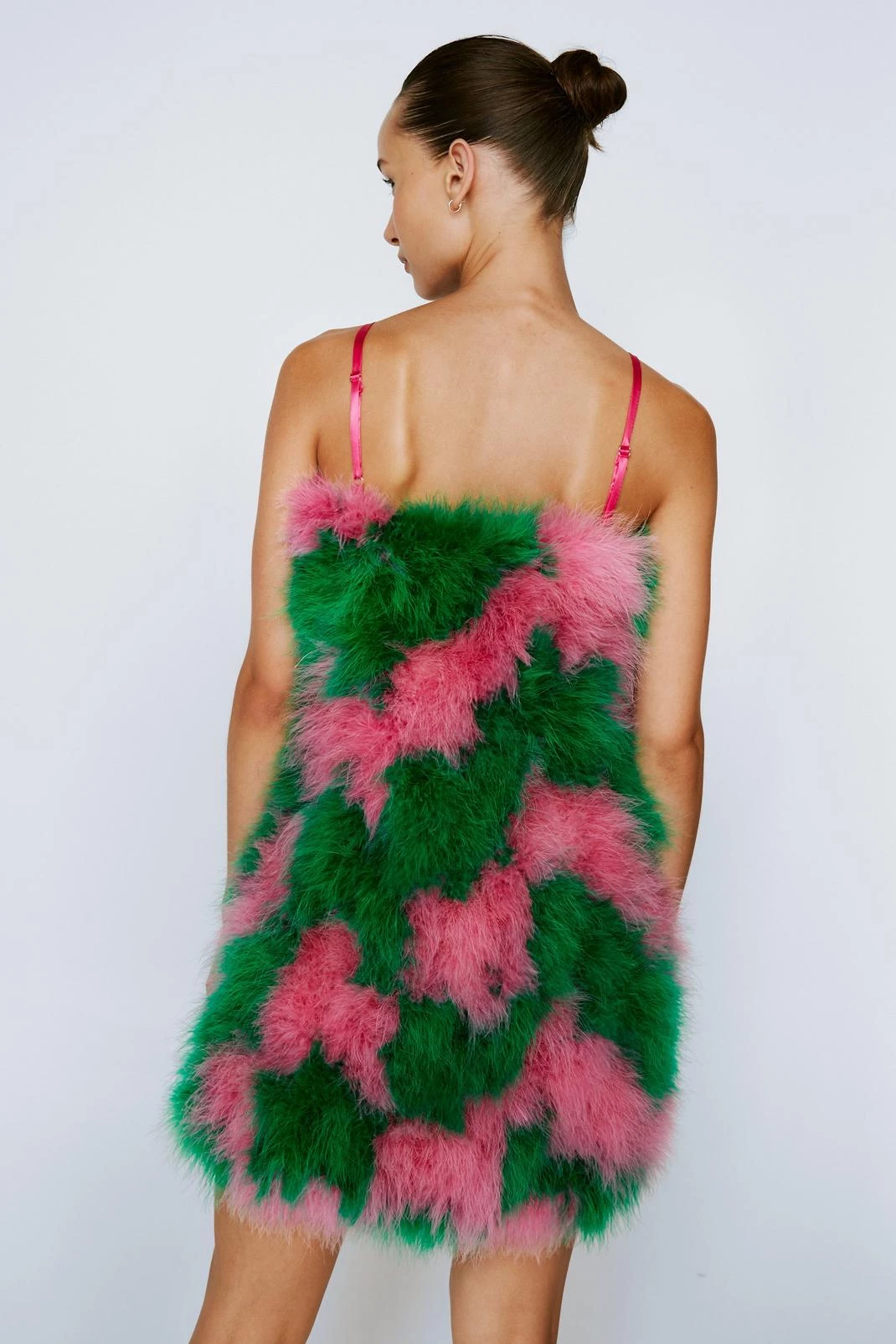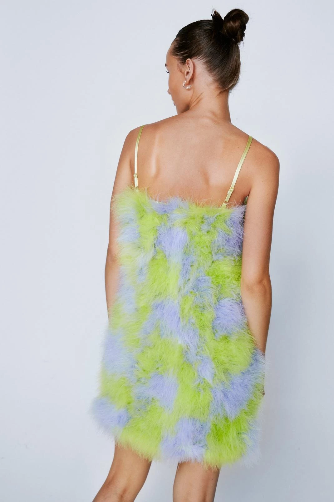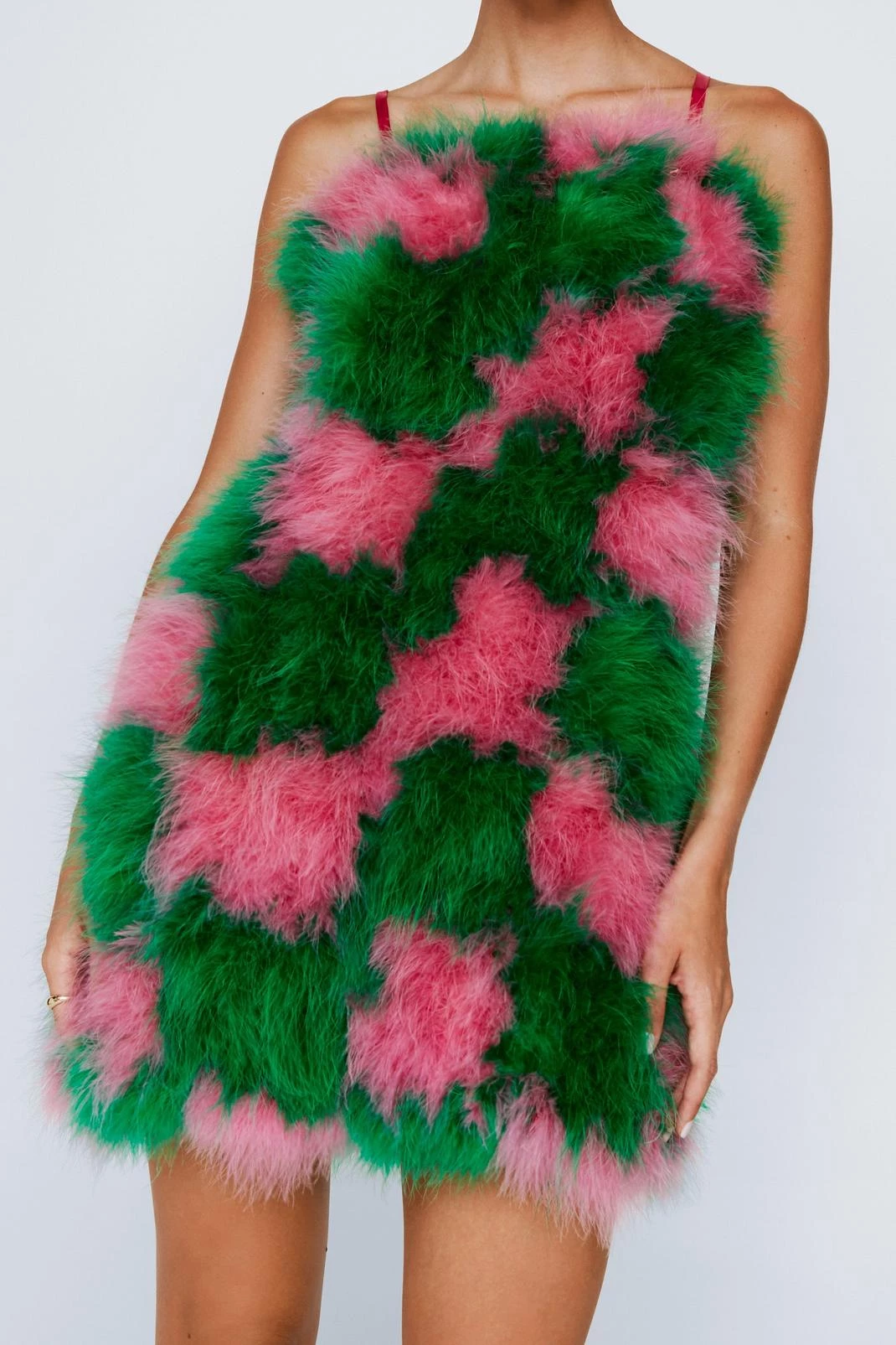 Best dressed. Featuring a strappy bodycon silhouette and a checkerboard feather design, this dress boasts premium quality and elevated style. Let the dress do the talking with minimal accessories and pared back heels.